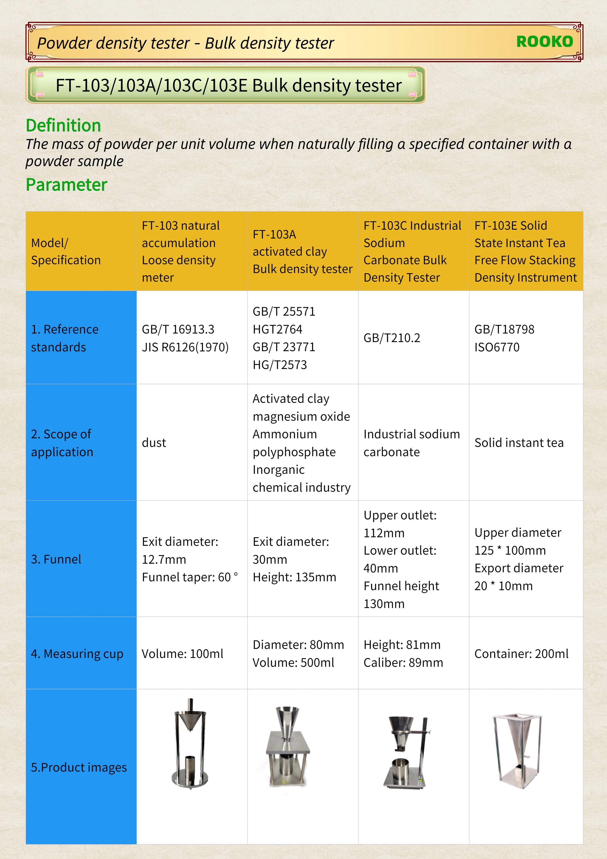FT-104 104A 104C Apparent density, angle of repose, flow angle, liquidity